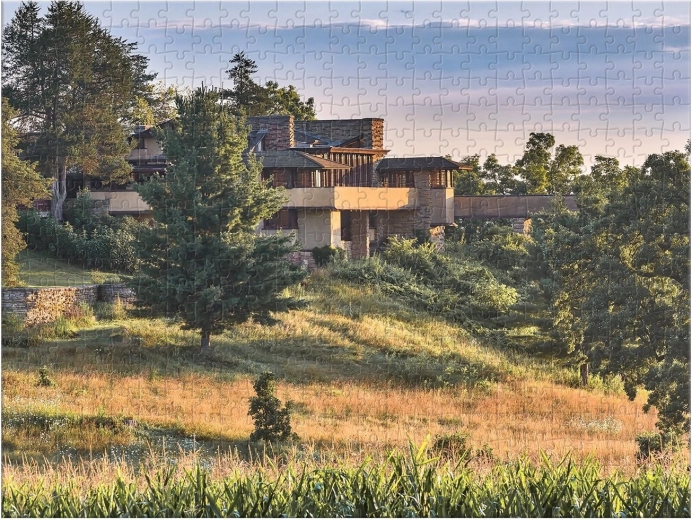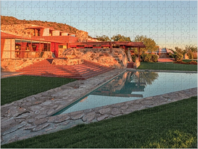 Erleben Sie doppelte Freude mit diesem faszinierenden doppelseitigen Puzzle, das ikonische Fotografien des berühmten amerikanischen Architekten **Frank Lloyd Wright** beinhaltet.