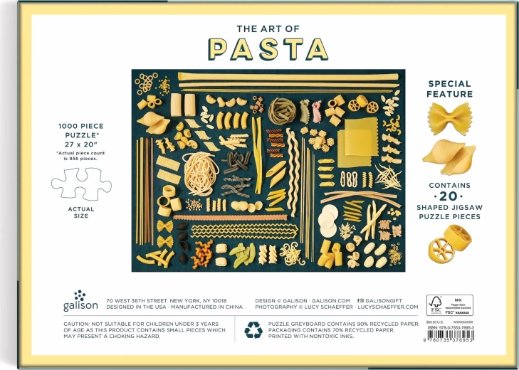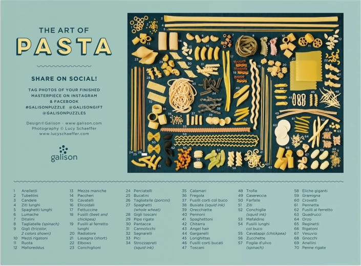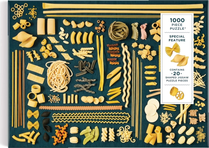 Das Puzzle enthält 20 spezielle Teile in Pasta-Form. Im Lieferumfang ist eine Vorlage des zu legenden Motivs enthalten. Abmessungen des fertig gelegten Puzzles ca. 69 x 51 cm