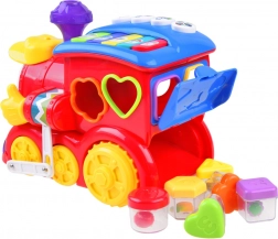 Das Set enthält Bausteine und nummerierte Klötze, die das Kind den entsprechenden Öffnungen an der Lok zuordnen kann. Jeder Block enthält Frucht- und Zahlen- oder Buchstabensymbole, die zum Lernen beitragen. Dank dieser interaktiven Elemente wird die Lokomotive zu einem großartigen Werkzeug zur Entwicklung motorischer Fähigkeiten und logischen Denkens.