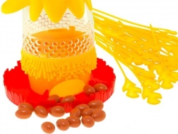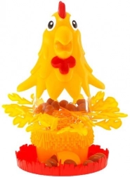 Setzt das Nest auf den Sockel, befestigt den transparenten Hühnerkörper mit Kopf, steckt die Federn in die Öffnungen und füllt den Bauch mit Eiern. Dann heißt es vorsichtig die Federchen „zupfen“ und die Eier so lange wie möglich im Nest halten. Gespielt wird im Uhrzeigersinn und jeder Zug sorgt für Spannung.