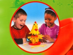 Baut die Basis mit dem Nest auf, befestigt den Hühnerkörper, steckt die Federn ein und füllt die Eier hinein. Farbige Teile aus robustem Kunststoff laden zum wiederholten Spielen ein.