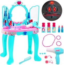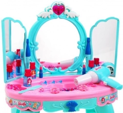 Der interaktive Schminktisch begeistert kleine Mode- und Schönheitsfans. Er besteht aus stabilen und sicheren Materialien in zarten Pastelltönen von Rosa und Türkis, die freundlich und elegant wirken. Durch das Drücken des Herzchens über dem Spiegel werden sanfte LED-Lichter und Melodien aktiviert, die eine magische Atmosphäre schaffen.
