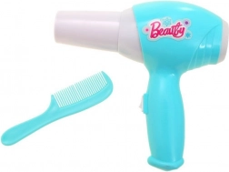 Enthalten sind ein batteriebetriebener Kinderföhn, Kamm, Schmuck und Kosmetik-Imitate – alles für realistisches und kreatives Spiel.