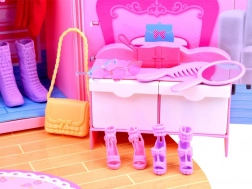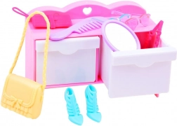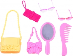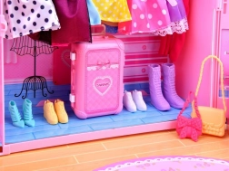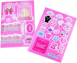 Das Set umfasst eine bunte Auswahl an Kleidchen, Schuhen, Handtaschen, Kamm, Spiegel sowie Brille und zusätzlich Aufkleber zur Personalisierung des Schranks. Unendliche Kombinationsmöglichkeiten.