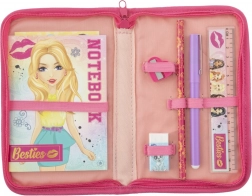 Gehen Sie mit diesem stylischen Schulmäppchen Besties zur Schule, das alles enthält, was Sie brauchen: Lineal, Anspitzer, Kugelschreiber, Bleistift, Radiergummi und Notizbuch.