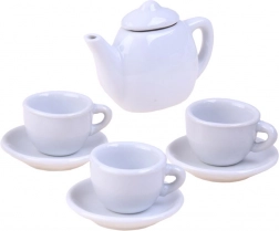 Die glatte, weiße Oberfläche ist ideal zum Bemalen. Maße: Tasse Höhe 3 cm, Untertasse Durchmesser 6 cm, Kännchen mit Deckel Höhe 6 cm.