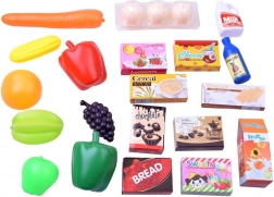 Das Set enthält verschiedene Arten von realistisch aussehenden Kunststofflebensmitteln, die Kinder erforschen und in ihrem imaginären Geschäft verwenden können.