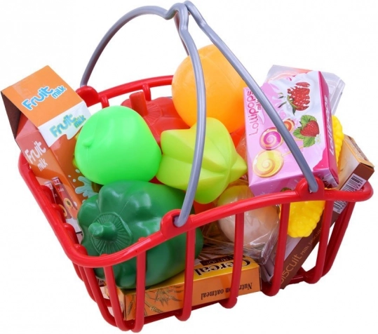 Praktischer roter Korb für das Tragen von Kleinigkeiten, der Kindern beibringt, Einkäufe zu organisieren und zu transportieren.