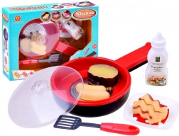 Das Set beinhaltet eine Pfanne, einen Deckel, verschiedene Arten von Lebensmitteln und Zubehör, das Kinder beim Spielen von Kochszenarien verwenden können.