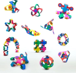 Universelle vierblättrige Teile verbinden sich zu flachen und räumlichen Modellen. Bauen Sie eine Brücke, ein Armband, einen Ball oder ein Windrad und verändern Sie die Formen im Handumdrehen.