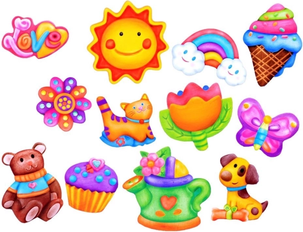 Sonne, Blumen, Schmetterlinge, Regenbögen, Eistüten, Cupcakes, Teddybären, Gießkannen, Katzen, LOVE