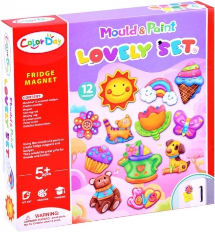 Dieses DIY-Set bringt Kindern Bastelspaß vom ersten Anrühren des Gipses bis zum finalen Bemalen. Die Formen beinhalten beliebte Motive wie Sonne, Blumen, Schmetterlinge, Regenbögen, Eistüten, Cupcakes, Teddybären, Gießkannen, Katzen und den Schriftzug LOVE. Die fertigen Werke werden mit Magnetband versehen und können Kühlschrank, Tafel oder jede metallische Oberfläche schmücken.