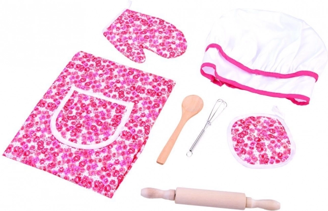 Enthält alle Notwendigkeiten für die kleine Köchin: Schürze, Mütze, Handschuh, Untersetzer und Küchenwerkzeuge.