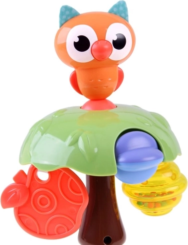 Die magische Rassel mit Eulenmotiv ist aus hochwertigem Kunststoff gefertigt und verfügt über einen Saugnapf, der eine einfache Befestigung auf glatten Oberflächen wie Tisch oder Stuhl ermöglicht. Dieses bunte Spielzeug ist der ideale Begleiter beim Füttern oder bei regulärem Spiel. Die Rassel ermöglicht es dem Kind, das Spielzeug zu beobachten, zu drehen und zu bewegen, was seine sensorische und motorische Entwicklung fördert.