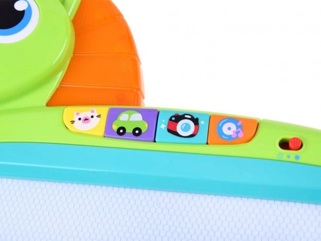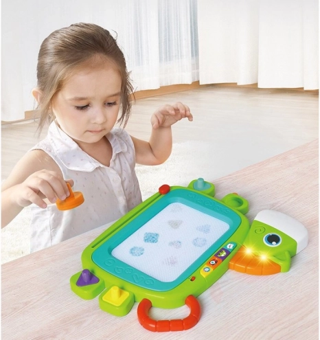 Diese bunte magische Tafel hat viele fantastische Funktionen, die die Kreativität und Feinmotorik der Kinder fördern. Sie können darauf mit einem Stift zeichnen, schreiben oder Muster mit Stempeln kreieren. Nachdem die Zeichnung fertig ist, kann das Bild leicht mit dem Schiebewischmechanismus gelöscht werden. Das interaktive Spiel wird von Licht- und Klangeffekten begleitet:
