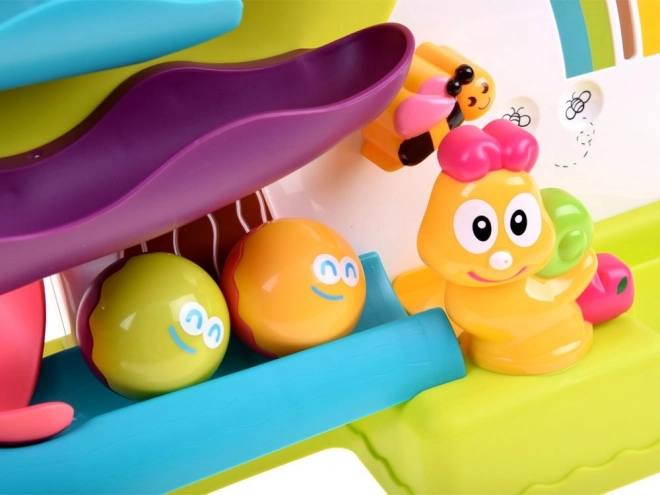 Die farbenfrohe interaktive 2-in-1-Bahn für Kugeln und Auto bietet vier Ebenen Spaß, fröhliche Musik mit Lautstärkeregelung sowie die Förderung der kindlichen Motorik und Fantasie. Dank der beidseitigen Konstruktion genießen Kinder zwei Spiele in einem – Kugelbahn und Abfahrt für das Auto. Das Spielzeug unterstützt Koordinationsfähigkeiten, visuelle Wahrnehmung und Ursache-Wirkungs-Denken.