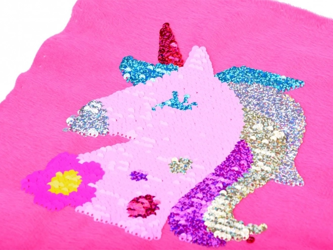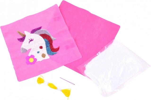 Kreativset zur Herstellung eines Kissens mit Einhorn-Pailletten. Erstellen Sie Ihr eigenes weiches und stilvolles Kissen mit einem magischen Einhorn-Motiv. Dieses Set ermöglicht es Kindern, eine Dekoration für ihr Zimmer zu kreieren, die sie selbst herstellen.