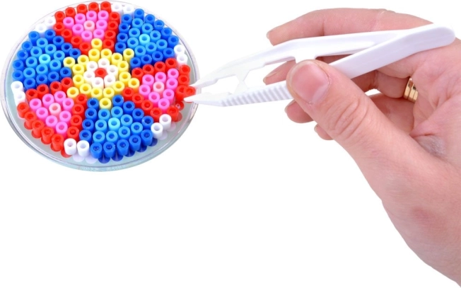 Mehrere farbige Beuteln und verschiedene Formen von Steckplatten und Vorlagen ermöglichen das Gestalten von Tieren, geometrischen Mustern und Figuren. Der Kreativität sind keine Grenzen gesetzt.