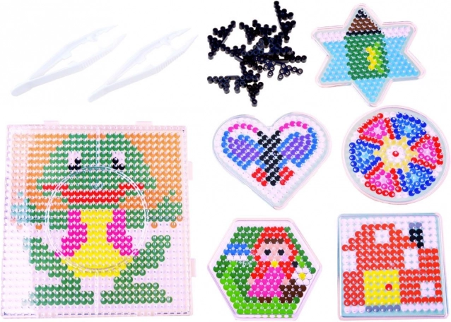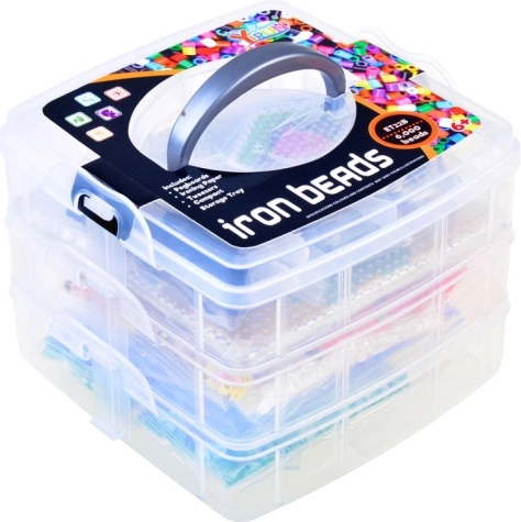 ca. 6000 Bügelperlen, 6 Vorlagen, 10 Steckplatten, 12 Beutel mit Perlen in verschiedenen Farben, 2 Pinzetten, 2 Pergamentpapiere, Aufbewahrungsbox mit Fächern
