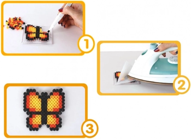 Perlen auf die Steckplatte legen, mit Pergament abdecken und bügeln – im Handumdrehen entsteht ein stabiles Mosaik, das sich ausstellen oder als Anhänger tragen lässt.