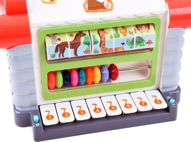 Buntes interaktives Häuschen für Kinder ab 18 Monaten, das Formensortieren, reale Tiergeräusche, fröhliche Melodien, ein Mini-Klavier, ein Zählrahmen und weitere Aktivitäten verbindet. Fördert Feinmotorik, logisches Denken, Erkennen von Formen und Farben sowie erstes musikalisches Empfinden.