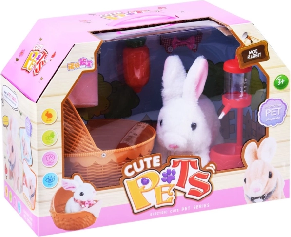 Ein niedliches weißes Kaninchen mit rosafarbenen Öhrchen macht jedes Kind glücklich. Mit eingelegten Batterien bewegt sich das Kaninchen nach vorn, wackelt komisch mit der Nase und gibt kaninchentypische Geräusche von sich. Enthalten sind ein Körbchen mit Decke, eine Karotte und ein Schnuller/Fütterfläschchen für eine realistische Pflege des Haustiers.