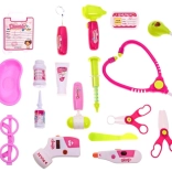 Stethoskop mit blinkendem Herz, Thermometer und Blutdruckmessgerät mit beleuchteten Werten, Otoskop, Spritze, Schere, Hammer und weiteres Zubehör.