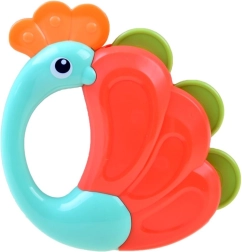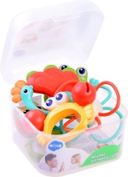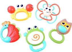 Kollektion von 5 bunten Rasseln für die jüngsten Kinder, die helfen die Welt zu entdecken. Die Produkte stimulieren die Sinne, unterstützen die Entwicklung der Motorik und die Hand-Auge-Koordination dank verschiedener Farben und Formen.