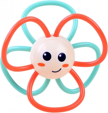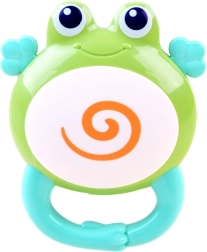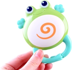 Diese Rassel hat ein fröhliches Froschdesign mit einem türkisfarbenen Griff und einem orangefarbenen Wirbel auf dem Bauch. Sie bietet Unterhaltung und Stimulation für Kinder.