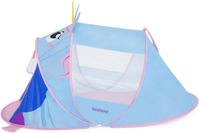 Entdecken Sie die Magie des fantasievollen Spiels mit dem Spielzelt in Einhornform, das Kinder mit fröhlichen Farben und einem einladenden Design begeistert. Das Zelt baut sich in kürzester Zeit von selbst auf und ist damit bereit für Spaß zu Hause, auf der Terrasse, im Garten oder am Wasser. Das strapazierfähige Polyestermaterial und die seitlichen Mesh-Paneele sorgen für gute Luftzirkulation und Übersicht für die Eltern.