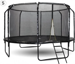 Die Sprungfläche aus hochwertigem Polypropylen ist mehrfach vernäht (bis zu 8 Nähte) und mit oxidierten Federn ergänzt, die von einem Schutzrand abgedeckt werden. Stabilität gewährleisten U‑Füße mit Schrauben, die von innen an der Konstruktion montiert sind – die Außenseite bleibt glatt und sicher. Im Paket finden Sie außerdem eine Leiter, Erdanker mit Spanngurten und eine wasserabweisende Abdeckung für einfache Nutzung und Pflege.