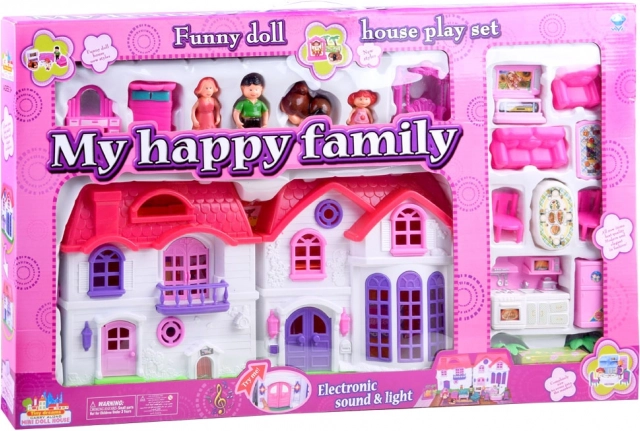 Elegantes, faltbares Familien-Puppenhaus aus robustem Kunststoff bringt Kindern stundenlange, fantasievolle Unterhaltung. Es enthält umfangreiches Zubehör, Figuren der Familie samt Hund, eine Klingel mit Lichteffekt und bunte Aufkleber zur individuellen Gestaltung jedes Zimmers.