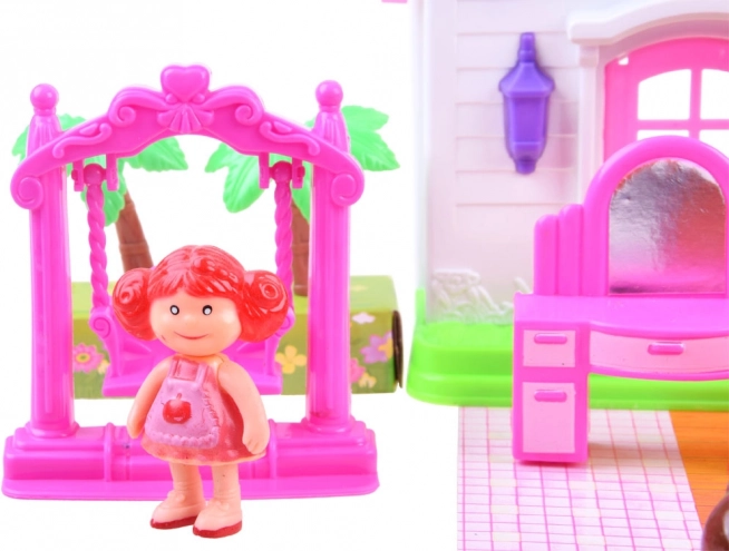 Das klappbare Haus begeistert mit lebendigen Farben und detailreicher Ausführung – die Fassade ist mit Blumen- und Vogelreliefs verziert. Nach dem Öffnen entsteht ein übersichtlicher Spielbereich, in dem Kinder die Möbel leicht platzieren können. Die Figuren von Mutter, Vater und Tochter haben bewegliche Arme und drehbare Köpfe – ideal für viele Rollenspiele. Die praktische Klingel mit Lichteffekt kündigt den Besuch an und verleiht dem Spiel den Zauber eines echten Zuhauses.