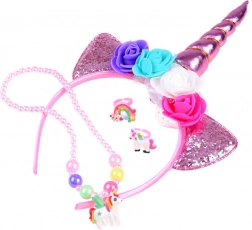 Süßes Set für kleine Fashionfans: enthält ein Einhorn-Stirnband, eine bunte Halskette und zwei Ringe. Das Stirnband hat ein weiches, glitzerndes Horn, einen satinierten Überzug für hohen Tragekomfort und eine florale Verzierung. Ideal für Karneval, Geburtstagsfeiern und das tägliche Spielen als Fee oder Prinzessin. Bequemer Sitz, glitzernde Details und ein magisches Einhorn-Design lassen jedes Kostüm erstrahlen.
