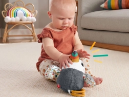 Weiche Beißringe lindern das Zahnfleisch, und das sanfte Rasseln zusammen mit dem Rascheln der Flügel schult das Gehör und die Aufmerksamkeit deines Babys.