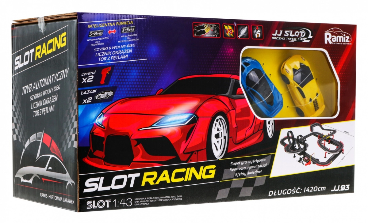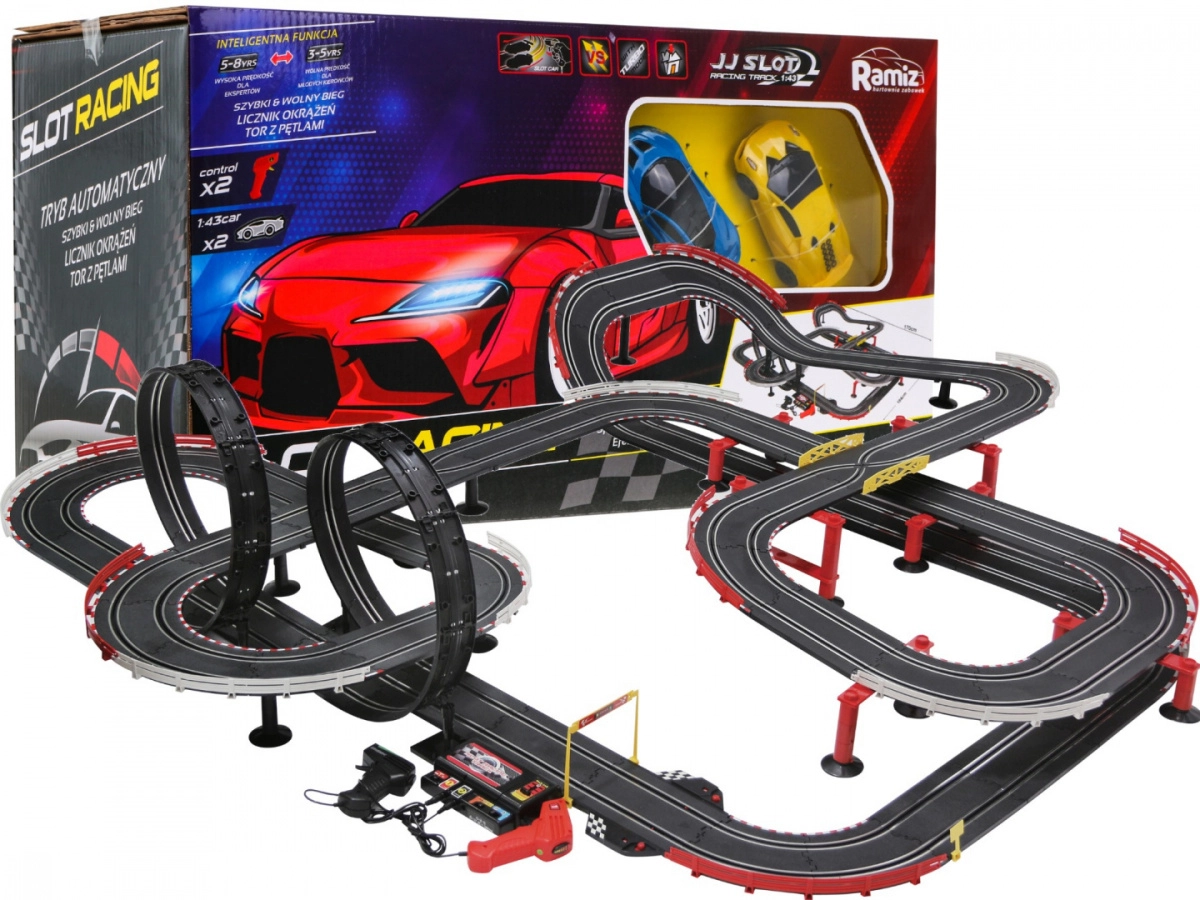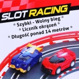Bauen Sie eine Strecke mit scharfen Kurven und Spiralen, die maximalen Nervenkitzel garantieren. 2 Rennwagen warten an der Startlinie. Kinder werden die lebendigen Farben und die sorgfältig ausgearbeiteten Details lieben.