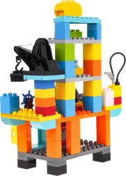 Baut einen kompletten Workshop mit Werkbank, Hebebühne und Aufbewahrungsschränken. Bunte Bausteine fördern Fantasie und selbstständiges Spiel.