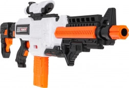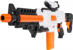 Der Fast Pioneer Blaster in Weiß-Orange-Schwarz ist ideal für Gefechte drinnen und draußen. Der halbautomatische Federmechanismus sorgt für schnelles und gleichmäßiges Feuern mit Einzelschüssen. Einfach Magazin laden, Netzschalter gedrückt halten, zielen und den Abzug betätigen.