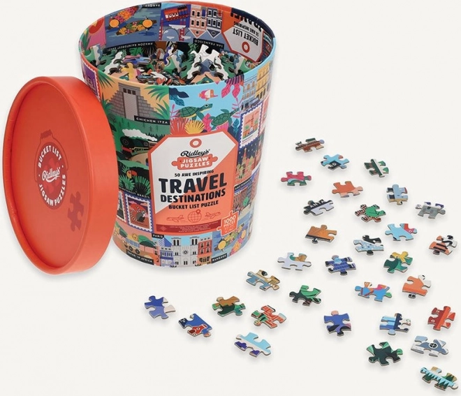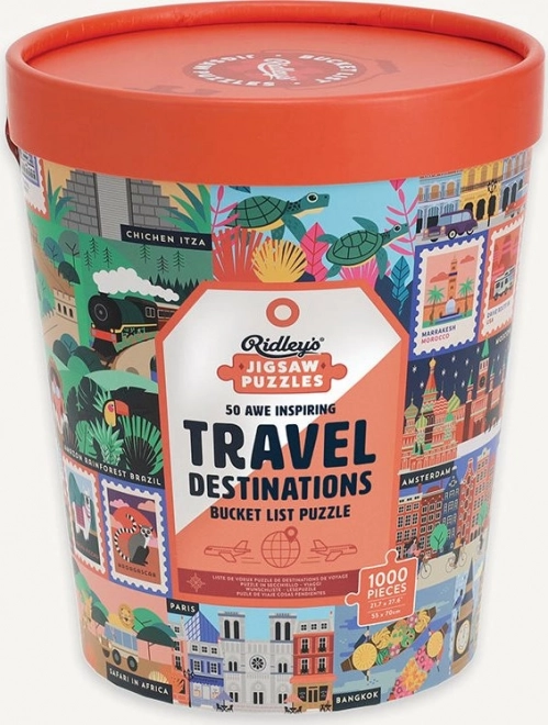 Puzzle Ridley's Games Bucket List: 1000 Teile, 50 ikonische Destinationen, stilvolle Eimerverpackung und Vorlage. Großartiges Geschenk für Reiseliebhaber.