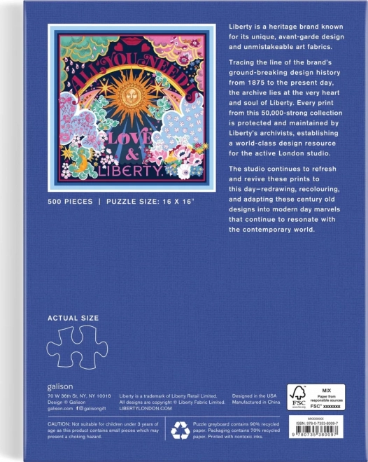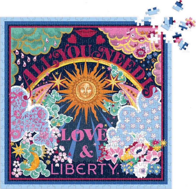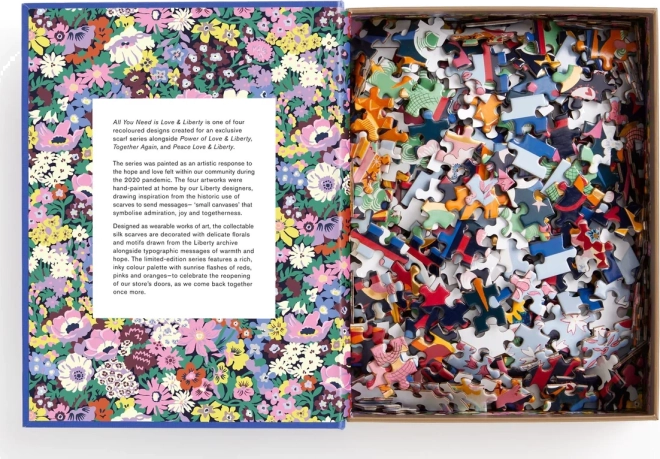 Unser quadratisches Liberty-Puzzle bietet eine einzigartige Kombination aus Kunst und Entspannung. Mit dem Motiv 'Alles, was du brauchst, ist Liebe' tauchen Sie ein in eine Welt, in der Liebe und Freiheit die Hauptthemen sind. Die Verpackung ist in Buchform gestaltet und macht es nicht nur zu einem Puzzle, sondern auch zu einem stilvollen Accessoire für Ihr Zuhause.