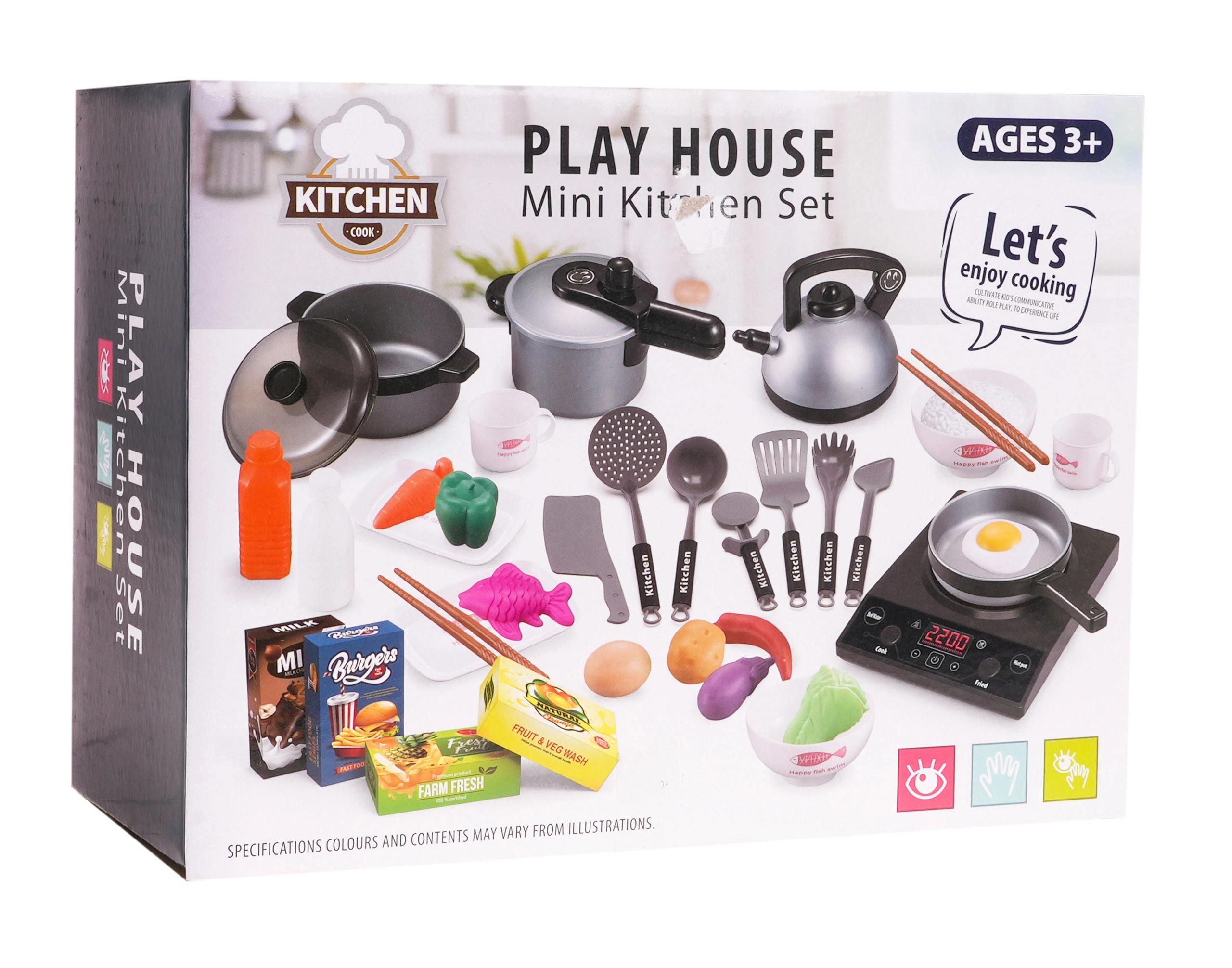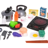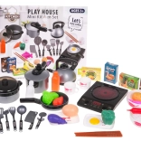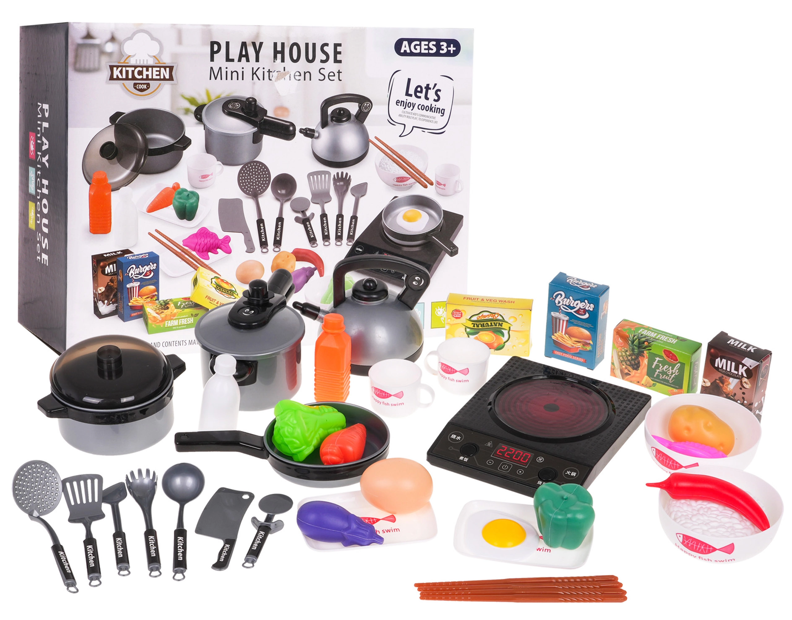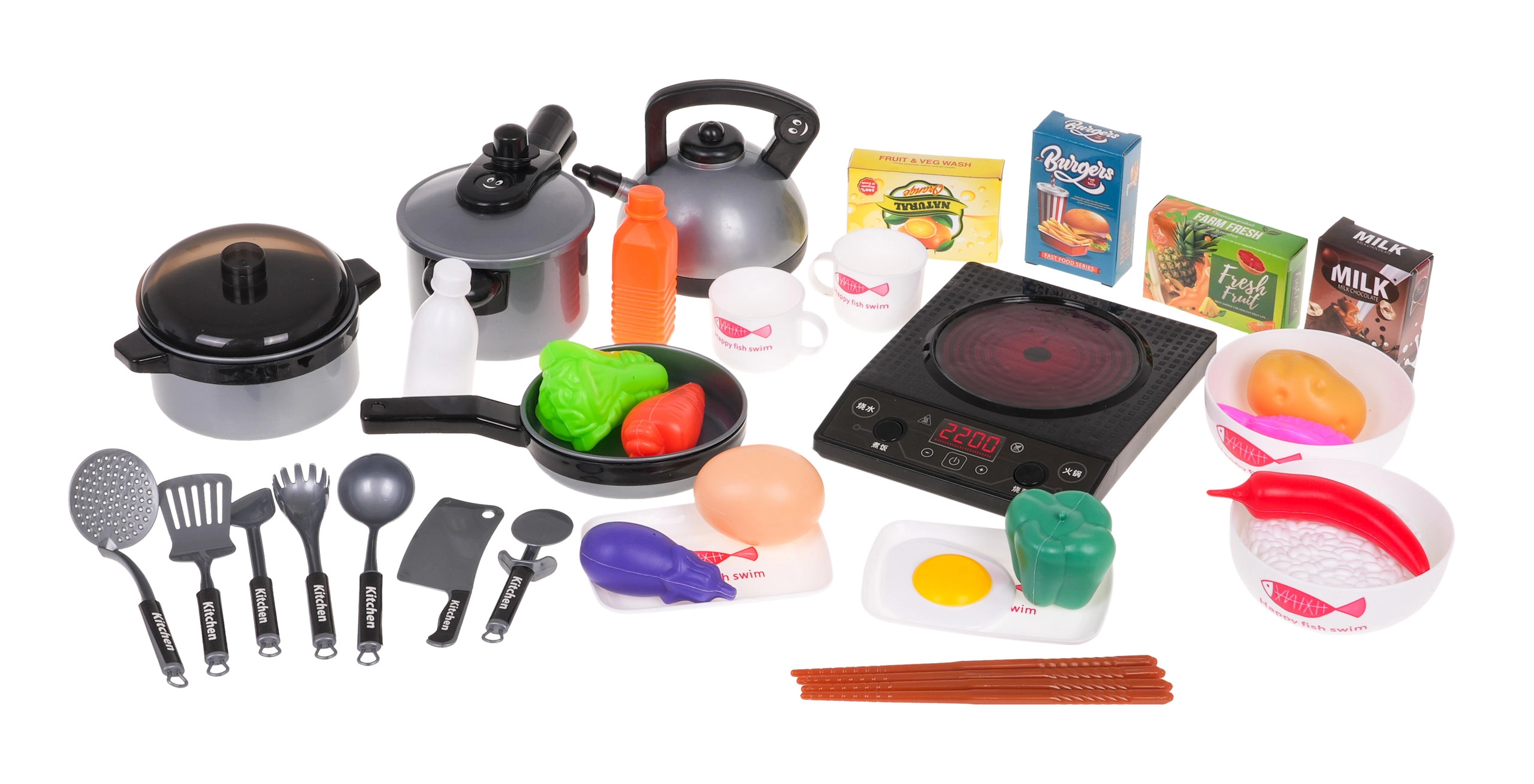 Dieses erstaunliche Küchenset enthält alles, was ein kleiner Koch benötigen könnte. Ein Induktionsherd, der mit drei AA-Batterien betrieben wird und realistische Brat- und Kochgeräusche ermöglicht. Sichere Plastikelemente wie Töpfe, Pfannen und weiteres Zubehör sind ideal für Kinderspiele, ohne scharfe Kanten und Verletzungsgefahr. Das Set enthält verschiedene Lebensmittelimitationen, einschließlich Eiern, Fisch und Gemüse, die die Authentizität des Spiels erhöhen.