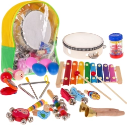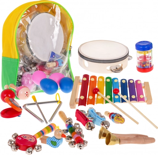 Wir präsentieren ein großes Holz-Musikset für Kinder ab 2 Jahren. Dieses farbenfrohe und sichere Set enthält 23 verschiedene Teile, alle ordentlich in einem praktischen Rucksack verstaut, der sich leicht transportieren lässt.