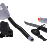 Das Set enthält eine Maske mit Atemschlauch, eine Spielzeugpistole, ein Messer und weitere realistische Zubehörteile für abenteuerliche Spiele.