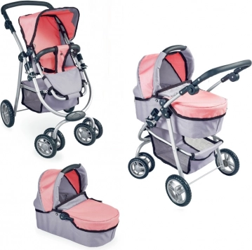 Kinderwagen für Puppen in moderner Kombination aus Rosa und Grau. Verstellbarer Griff und schwenkbare Vorderräder für maximalen Komfort und einfache Handhabung.