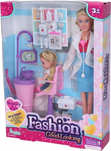 Im Set finden Sie eine Zahnärztin-Puppe, eine kleine Mädchen-Puppe und Zubehör inklusive Ausstattung der Zahnarztpraxis und medizinischer Utensilien. Dank der detailreichen Ausarbeitung und der Größe von 29 cm liegen die Puppen gut in der Hand und lassen sich mit weiterem Zubehör kombinieren.