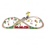 • Großes Set mit 57 Teilen: Schienen inklusive Brücken, Personenzug, Kran, Figuren, Bäume, Gebäude, Tiere und Arbeitsfahrzeuge.