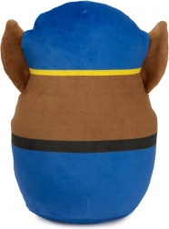 Plüsch in Form des Hundes Chase aus der beliebten Serie Paw Patrol, gekleidet in Polizeiuniform mit Abzeichen und Mütze.