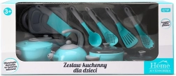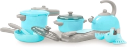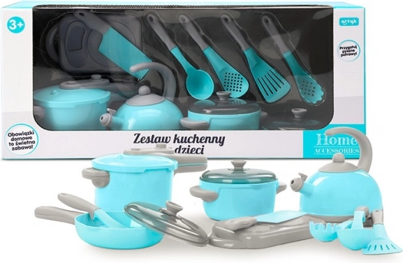 Kinder-Küchenset 11-tlg. bietet kleinen Köchinnen und Köchen alles, was sie für ihre ersten Kochabenteuer in der Fantasie brauchen. Enthält einen Topf mit Deckel, eine Pfanne, einen Wasserkocher mit Pfeife, Küchenutensilien und weiteres Zubehör in einer modernen türkis-grauen Farbkombination. Ab 3 Jahren, sichere und leicht zu reinigende Ausführung aus Kunststoff.