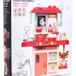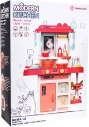 Die Kinderküche Moderne Küche bietet Kindern die Möglichkeit, ein echtes Küchenerlebnis mit echten Lichtern und Geräuschen zu erleben. Es enthält bewegliche Bestandteile wie drehbare Knöpfe und einen sich öffnenden Kühlschrank. Kleine Köchinnen und Köche werden auch die Dampfausgabe-Funktion und das Notiztafelsystem schätzen.