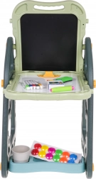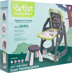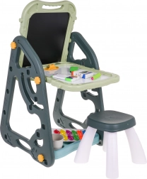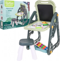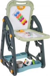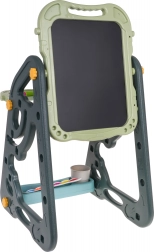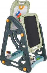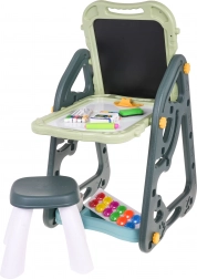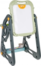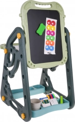 Das große multifunktionale Set besteht aus zwei Tafeln: Kreidetafel und Magnettafel, zusammen mit einem bequemen Hocker, ist eine ideale Wahl für Kinder ab 3 Jahren. Es bietet die Möglichkeit, die Tafeln in zwei Positionen zu stellen – auf einer Seite magnetisch, auf der anderen kreidebeschriftbar, oder als Tisch mit Fläche zum Zeichnen. Auf der weißen Seite kann man mit Markern schreiben oder farbige Magnete anbringen, während die schwarze Seite zur Kreidemalerei gedacht ist. Das Set enthält auch zwei Regale für Kunstmaterialien.